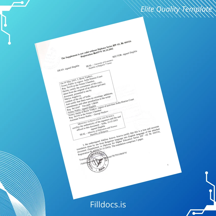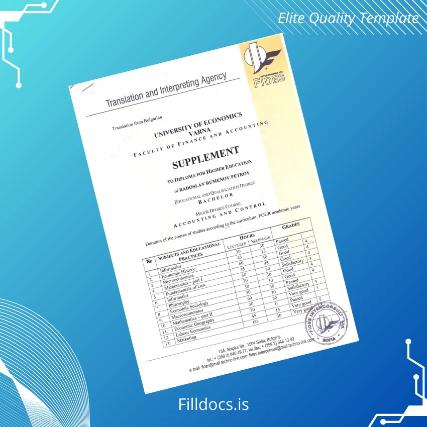 The Bulgaria University of Economics Varna Diploma Template – Word/PDF is a professionally crafted, fully customizable certificate designed for anyone needing an authentic-looking replacement or to create a professional diploma document with ease. This fillable template is perfectly suited for graduates, educational institutions, and professionals seeking a high-quality digital diploma form that is immediately editable and print-ready.