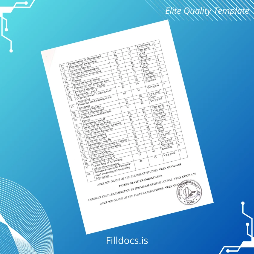 This digital diploma template serves as a blank form that can be customized to replicate the Bulgaria University of Economics Varna diploma accurately. It offers a novel design that blends traditional academic aesthetics with modern clarity, ensuring your diploma document looks both official and visually appealing. The template is ideal for those who need a quick replacement diploma or a customizable degree certificate for presentations.