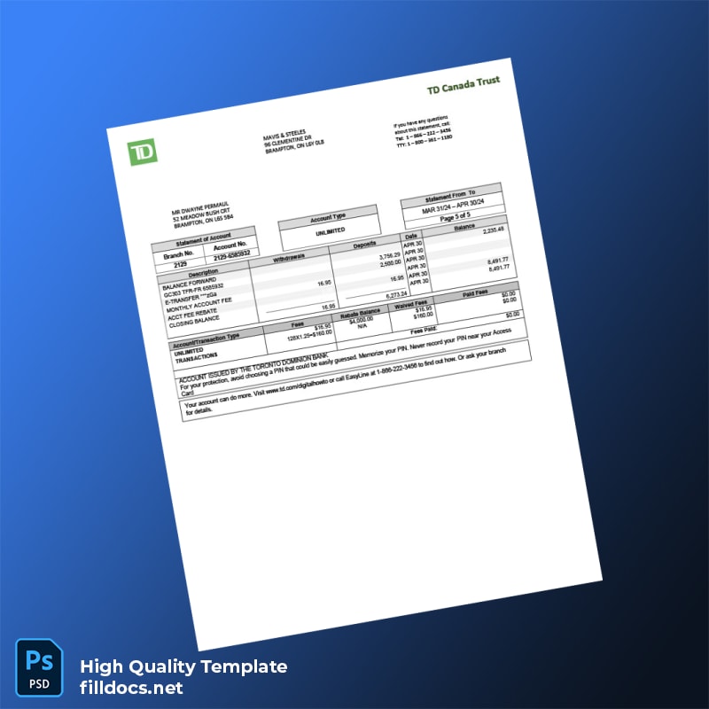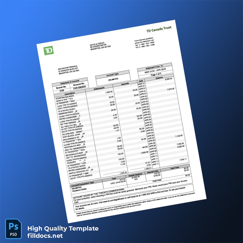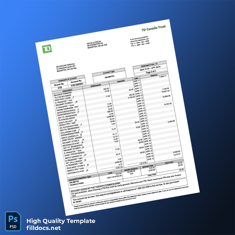 The Canada TD Canada Trust Bank Statement Template is your reliable solution for producing professional bank statements that are fully customizable to meet your specific needs. Available in both Word and PDF formats, this template is designed to cater to professionals who require quick, editable, and high-quality documents.