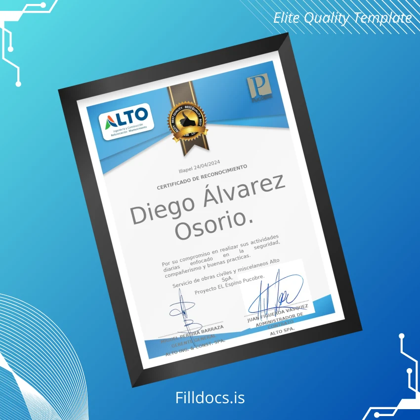 Enhance your professional recognition with the Chile Alto Ingeniería y Construcción Certificate of Recognition Template – Word/PDF, a versatile and fillable diploma designed for ease and quality. This customizable diploma template offers you the flexibility to create a personalized certificate that meets your unique needs quickly and efficiently.