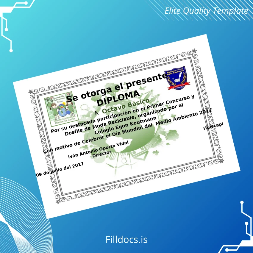 This template is a high-quality, editable diploma certificate available in both Word and PDF formats. It allows you to personalize all essential details such as the recipient’s name, graduation date, and course of study with ease. Designed for Chile Egon Keutmann School diplomas, it provides an authentic look with a novel design that suits official documentation needs.