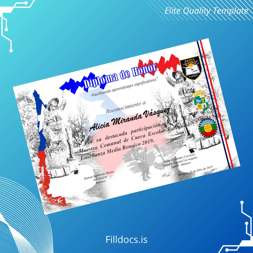 Discover the Chile Escuela Los Nogales Diploma of Honor Template – Word/PDF, a professional and customizable digital document designed for educators, administrators, and design professionals who require a high-quality fillable diploma template. This versatile template enables you to create polished diplomas with ease, whether for replacement purposes, novelty recognition, or official documentation needs.