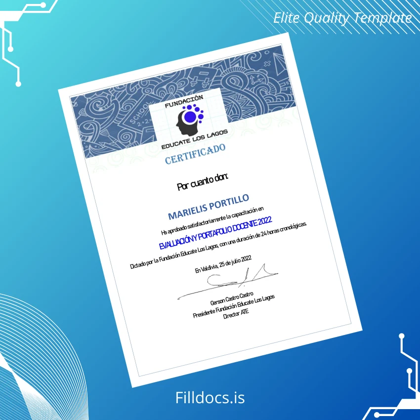 This Chile Fundación Educate Los Lagos Certificate in Evaluation and Teaching Portfolio 2022 Template – Word/PDF offers professionals an editable, high-resolution diploma design ideal for creating official recognition documents with ease and precision. It is a versatile, customizable digital download designed to cater to educators, institutions, and administrative staff who require a polished and professional certificate in a convenient fillable format.