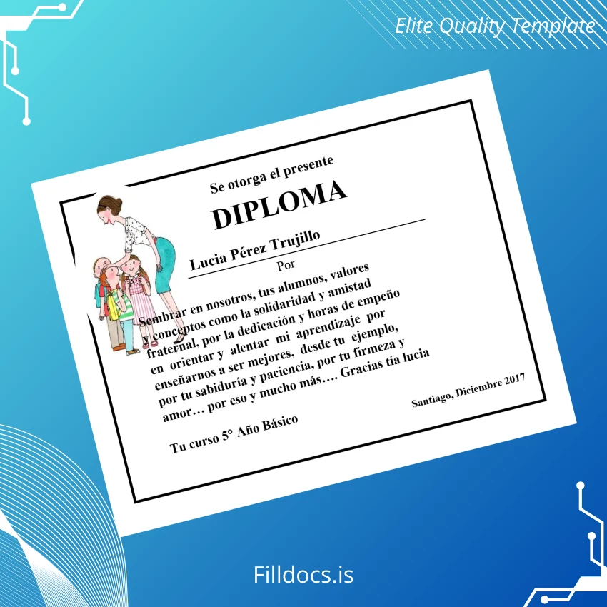 The Chile Lucia Pérez Trujillo 5th Year Basic Diploma Template – Word/PDF is a professionally designed, fully editable certificate template perfect for educators, institutions, and individuals who require a customizable and printable diploma. This fillable diploma form allows users to easily input personalized details such as names, dates, and signatures directly within Word or PDF software, streamlining the certification process.