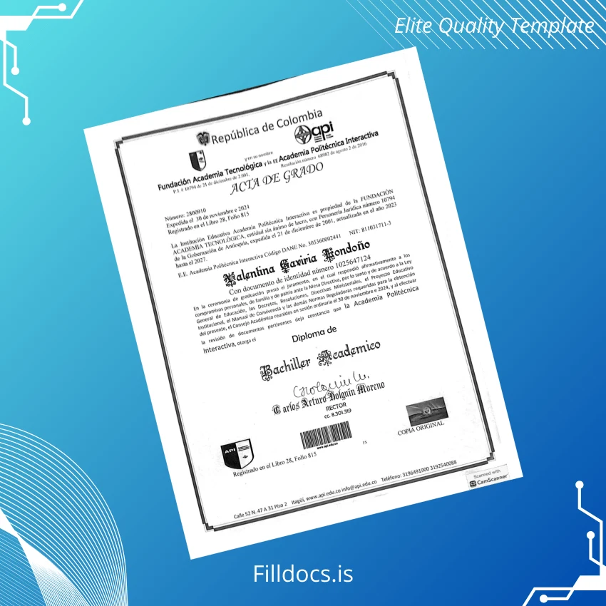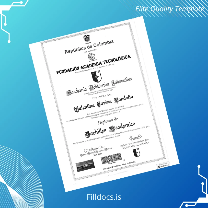 The Colombia Academia Politécnica Interactiva Bachiller Academic Diploma Template – Word/PDF is a professionally designed, fillable diploma template ideal for academic professionals and institutions seeking a customizable and high-quality digital diploma. This template offers a convenient and elegant solution for replacing or issuing academic credentials, featuring editable fields that allow users to quickly personalize the diploma with names, dates, and other essential information.