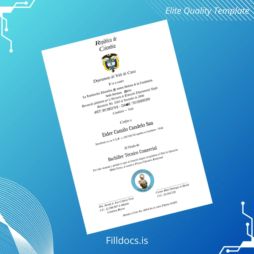 This digital diploma template provides a blank, editable diploma form in both Word and PDF formats, allowing users to customize all essential details such as name, institution, degree, and date. It features an authentic and novel Diploma Design inspired by Colombia’s Candelaria Valle Technical Bachelor certification, crafted to meet official standards.