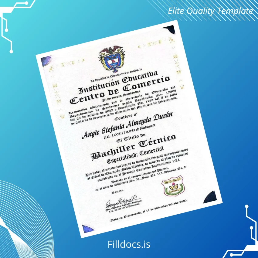 The Colombia Centro de Comercio Technical Bachelor Diploma Template – Word/PDF is a professional, fillable diploma certificate designed for quick and easy customization. This versatile template perfectly suits educators, administrators, and institutions aiming to produce authentic, print-ready diplomas with minimal effort. Featuring editable fields, you can effortlessly personalize essential details such as recipient names, dates, and achievement information.