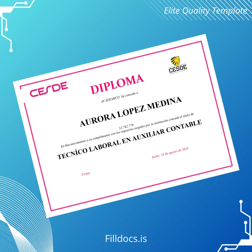 This digital diploma template is a meticulously crafted blank diploma form that provides a high-quality novelty diploma design. It is ideal for educational institutions, professionals, or individuals needing a replacement diploma template that accurately represents the Colombia CESDE Technician in Accounting certification. The digital diploma download is perfect for quick access, enabling fast customization and immediate use.