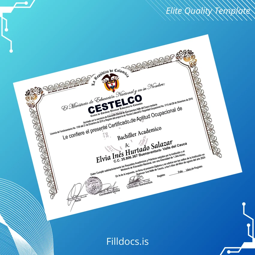 This template serves as a fillable diploma form specifically crafted for Colombia’s occupational aptitude certification. It is a blank diploma form that allows users to generate authentic-looking certificates within minutes, eliminating the hassle of starting from scratch. Ideal for professionals who require an immediate and accurate replacement diploma template, it combines aesthetic appeal with functional design to ensure credibility and compliance.