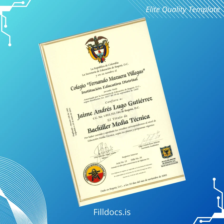This template is a meticulously designed high school diploma form tailored for Colombia’s Colegio Fernando Mazuera Villegas. It provides an editable format where all essential diploma information can be swiftly updated, making it ideal for replacing lost or damaged certificates or for personal archival purposes.