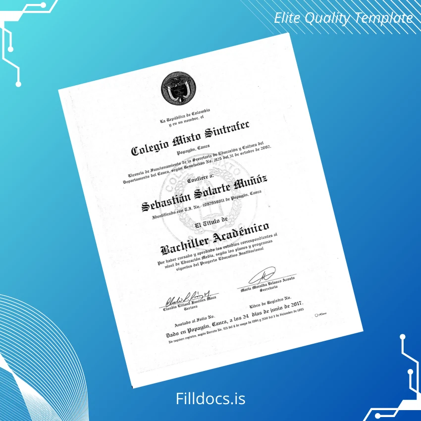 The Colombia Colegio Mixto Sintrafe Bachelor of Arts Diploma Template – Word/PDF is a professionally designed, editable diploma form tailored for academic institutions and individuals needing a replacement diploma or a customizable degree template. This digital download offers a novel approach to diploma design that seamlessly combines tradition with modern ease-of-use, ensuring it meets official requirements while providing customization flexibility.