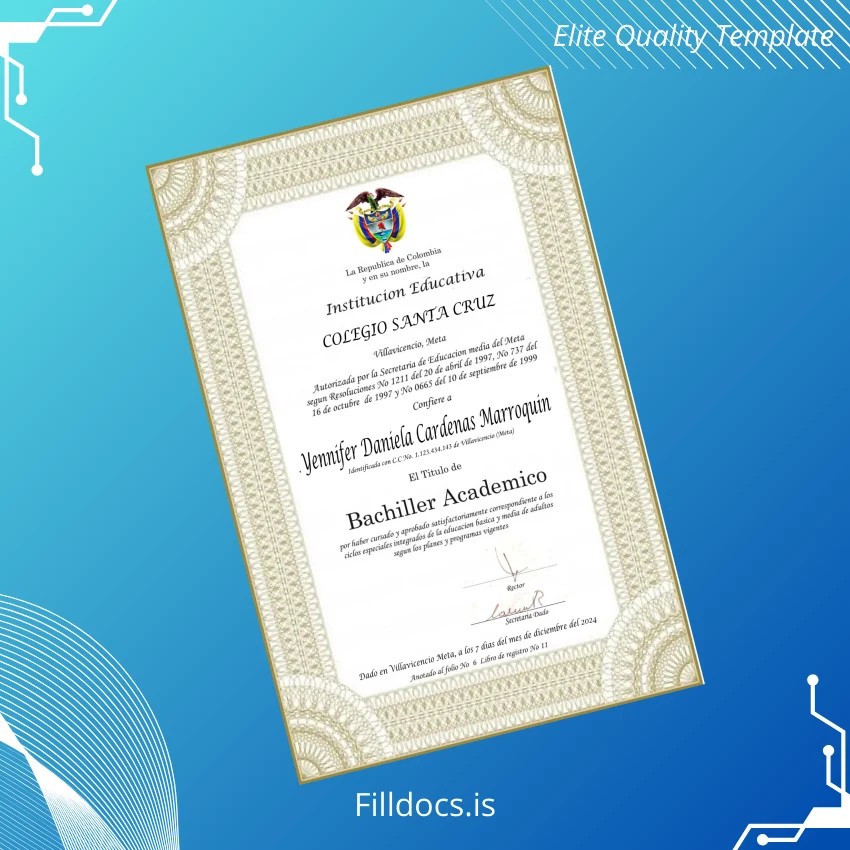 This template is a professionally designed, editable diploma form specifically tailored for Colombia Colegio Santa Cruz High School. It features a novel diploma design that users can download instantly in high-resolution Word and PDF formats. It acts as a customizable degree template or a replacement diploma template, perfect for individuals and organizations requiring a digital diploma with an authentic appearance.