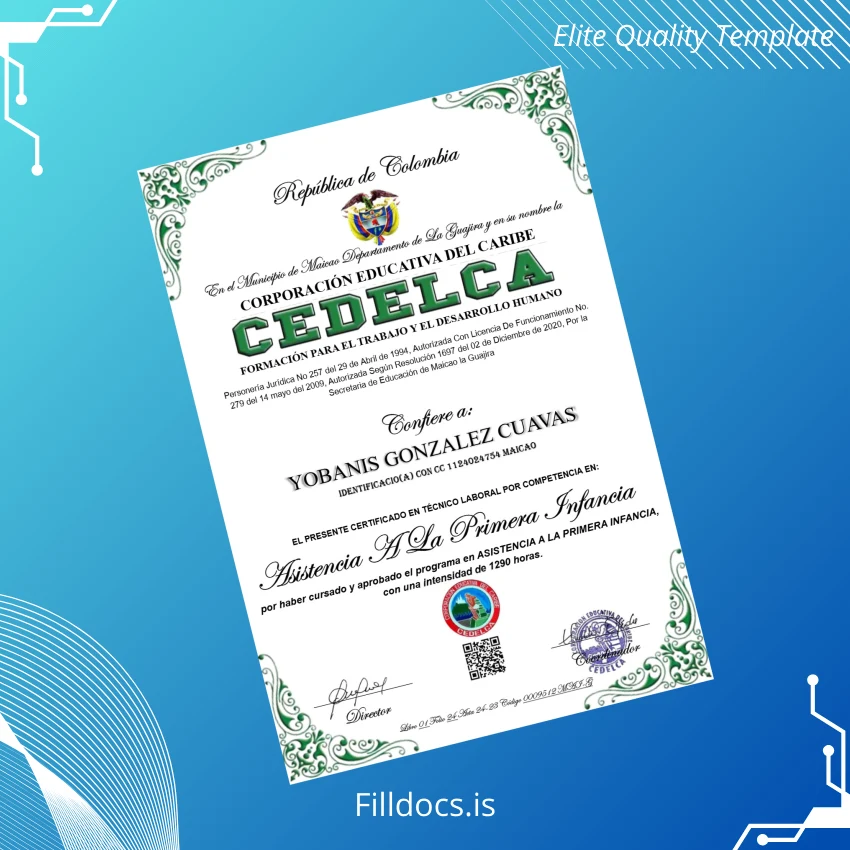 Discover the Colombia Corporación Educativa del Caribe Técnico Laboral Certificate in Early Childhood Assistance Template – Word/PDF, a professionally designed, fillable diploma template tailored for educational institutions and individuals needing a customizable certificate solution. This digital template empowers users to effortlessly create and personalize a high-quality certificate with ease, making it an essential tool for issuing or replacing diplomas promptly.