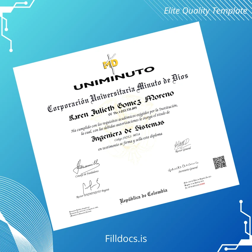 This template is a customizable degree certificate specifically crafted for the Colombia Corporación Universitaria Minuto de Dios Bachelor of Systems Engineering. It serves as a refined blank diploma form that can be used as a replacement diploma template or as a novel design for official documentation. Its editable format facilitates quick adjustments to meet exact specifications, providing a professional-looking certificate suitable for print and digital presentation.