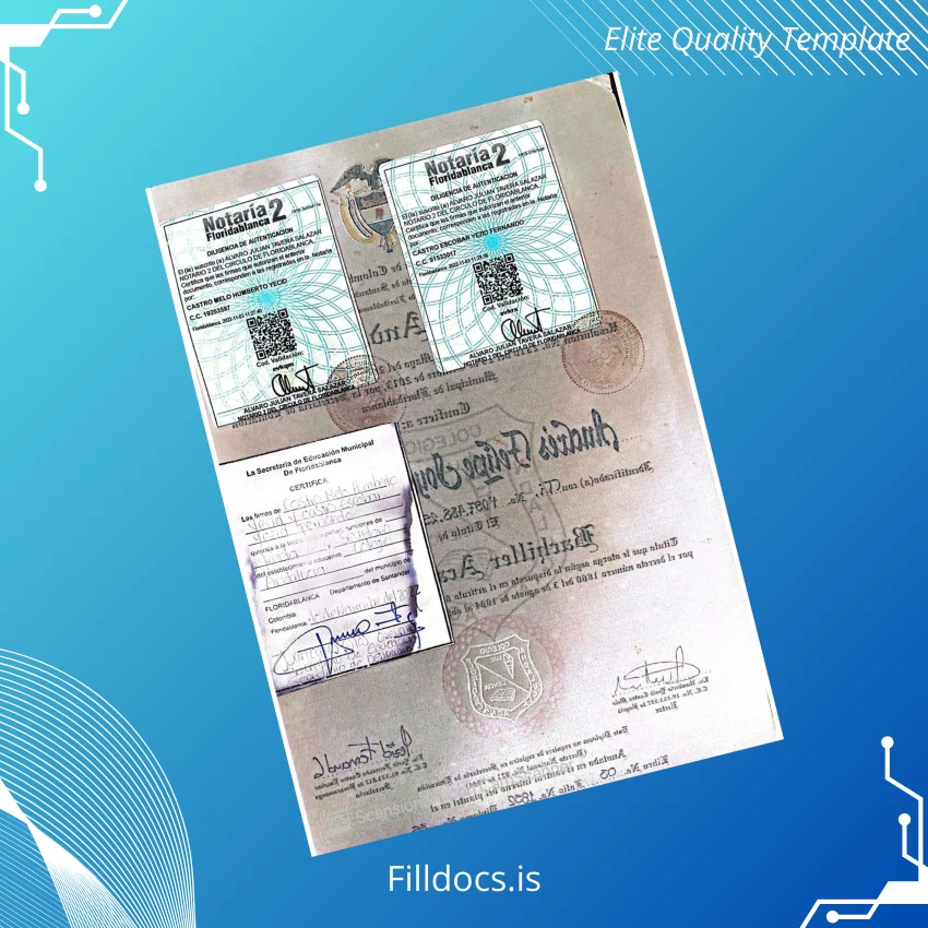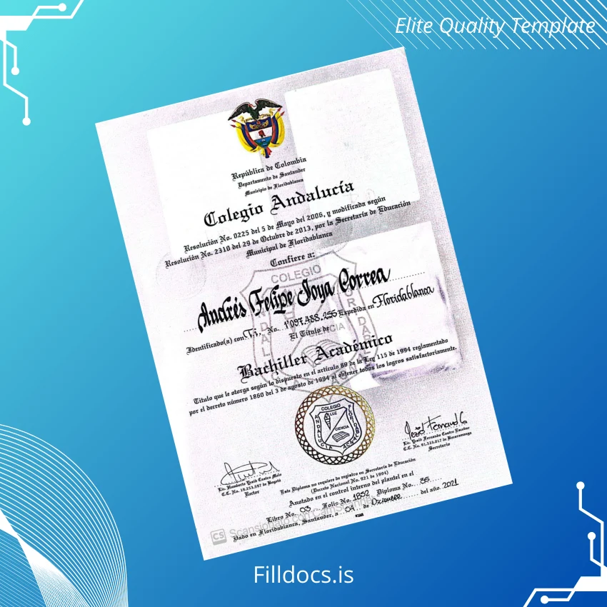 This template functions as a blank diploma form that allows users to replicate or translate Colombian diploma certificates effortlessly. It is ideal for creating a digital diploma download or printing a replacement diploma with a novel and elegant design that meets official standards.