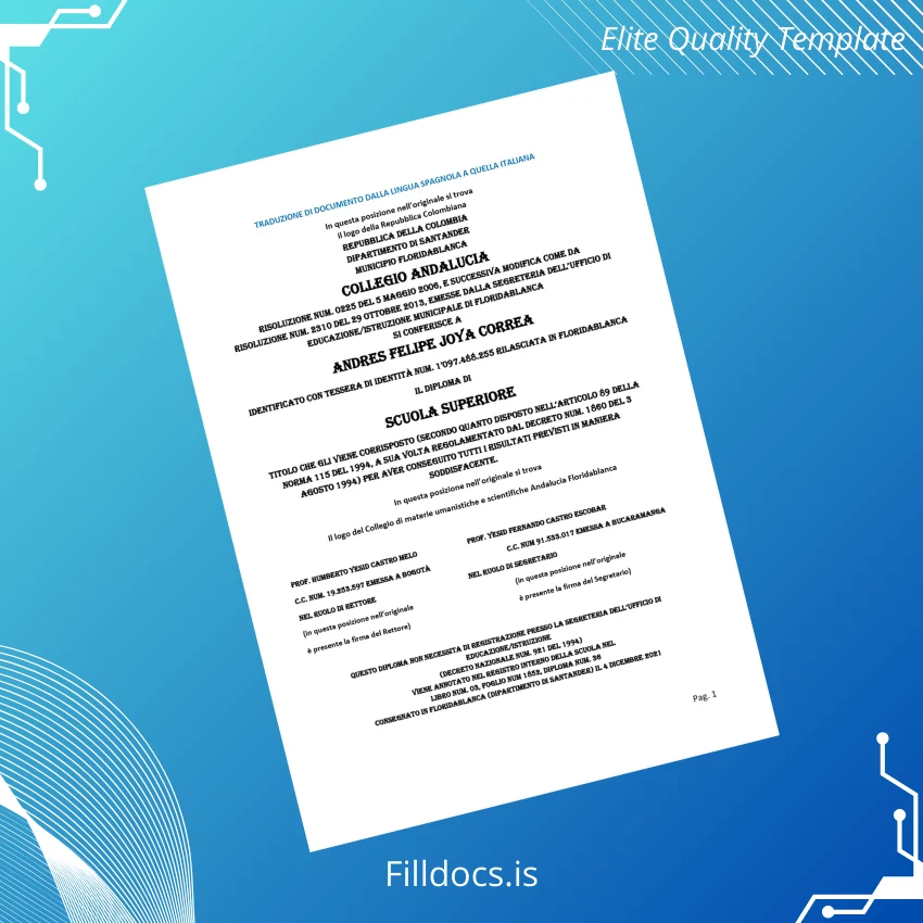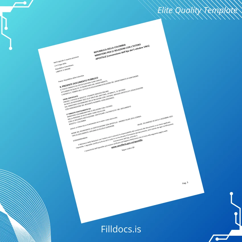 The Colombia Diploma Translation Template – Word/PDF is a professional, fillable template designed for those needing a customizable and replacement diploma certificate. This editable diploma template enables users to easily personalize their degree information with precision and convenience, making it an essential tool for graduates, educational administrators, and professionals seeking accurate diploma translations.
