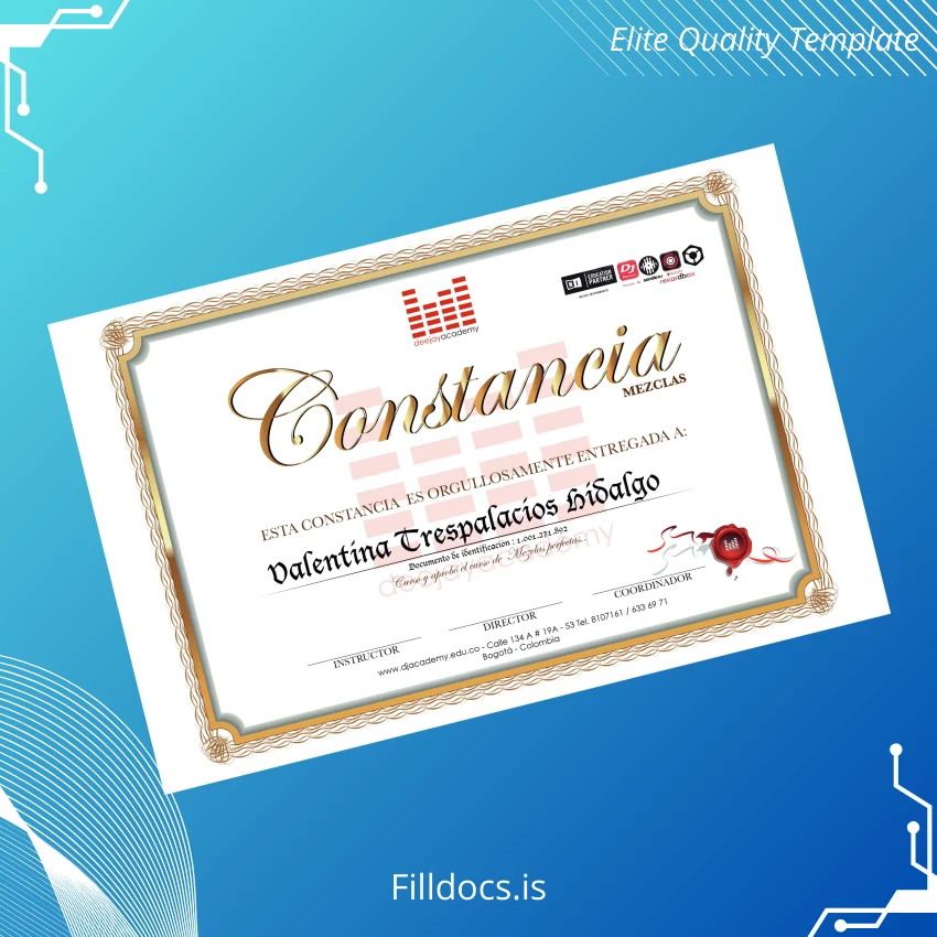 Discover the Colombia DJ Academy Certificate in Perfect Blends Template – Word/PDF, a meticulously designed digital diploma template tailored for professionals seeking an editable and print-ready certification solution. This fillable diploma template combines elegant design with functional versatility, perfect for creating customized certificates that reflect authenticity and professionalism.