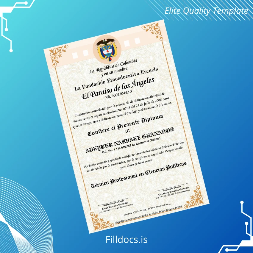 Discover the Colombia Fundación Etnoeducativa Escuela El Paraíso de los Ángeles Técnico Profesional en Ciencias Políticas Diploma Template – Word/PDF, a versatile, fillable certificate designed for professionals who need a prompt, customizable diploma solution. This template supports seamless editing, letting you personalize all essential details with ease. Whether you’re replacing a lost degree or designing a novelty diploma, this digital download fits diverse documentation needs perfectly.