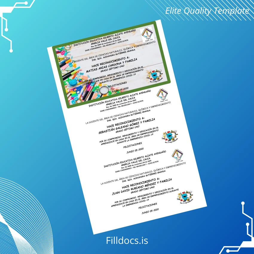 The Colombia Gilberto Alzate Avendaño Educational Institution Recognition Certificate Template is a versatile and expertly designed fillable diploma template available in Word & PDF formats, catering to professionals seeking a customizable and print-ready solution for official recognitions. This high-quality digital diploma download enables users to easily update and personalize the certificate fields including names, dates, and specific honors with precision and ease.