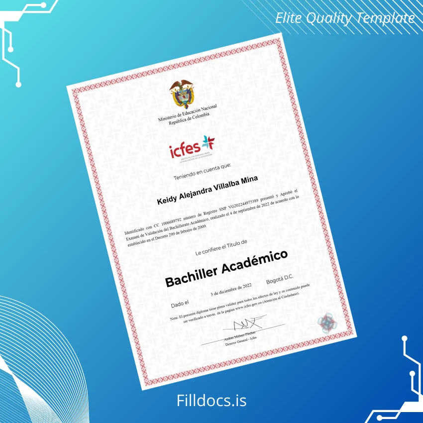 This template is a fully customizable digital diploma form crafted to mirror the official Colombia Icfes Academic High School Diploma. It provides users with a clean, professional foundation to generate accurate academic certificates with ease, suitable for both official and novelty purposes. Ideal for academic institutions or individuals requiring a precise replication or replacement diploma, it eliminates the need for manual redesign.