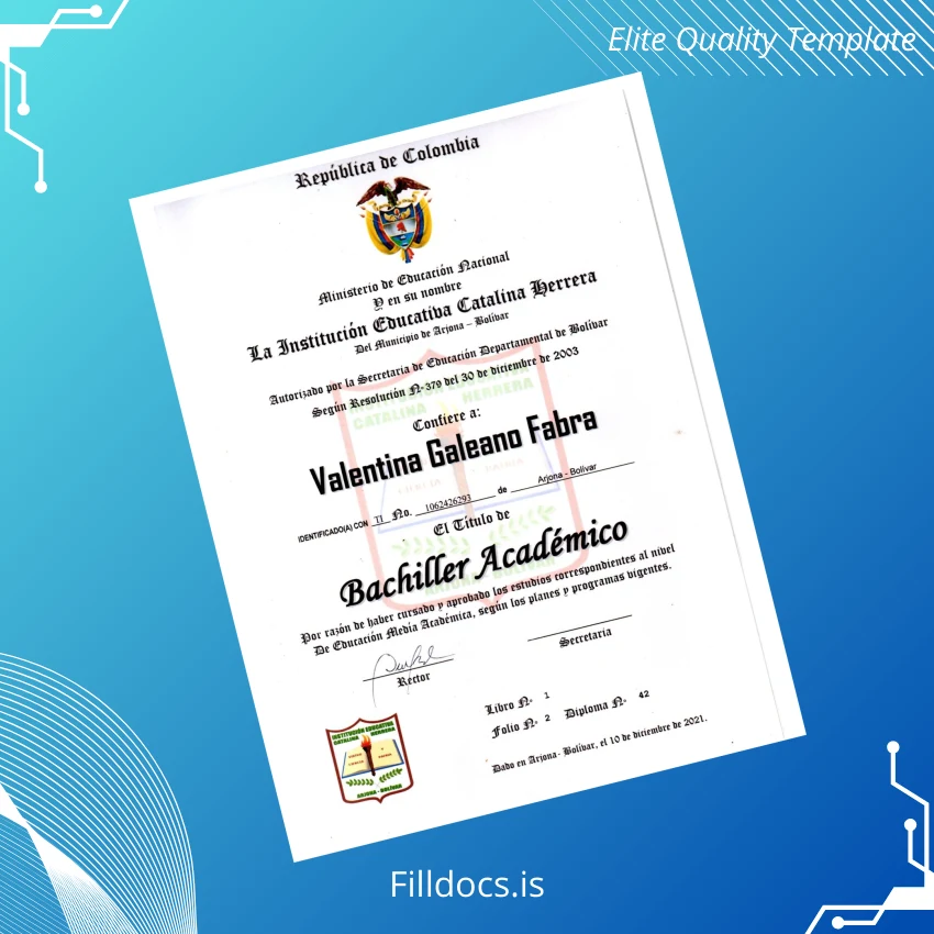 Fillable Colombia Institución Educativa Catalina Herrera High School Diploma Template – Word/PDF. Easily customize your own diploma with editable fields today.