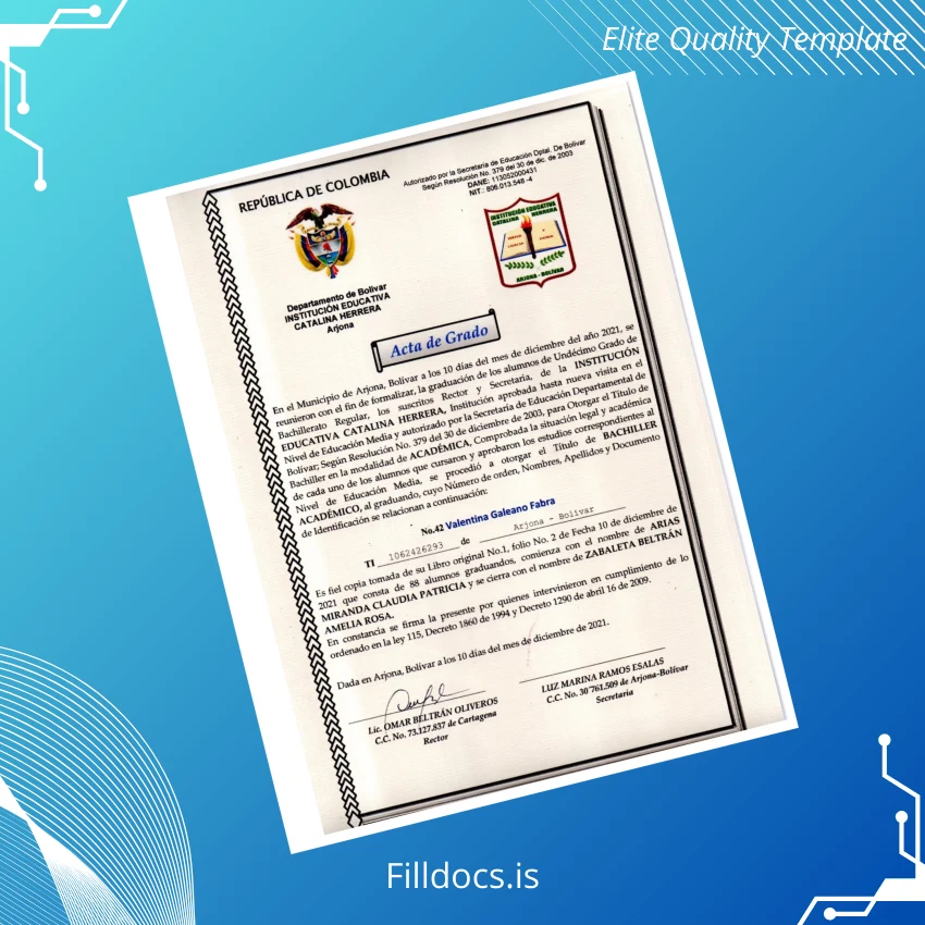 Discover the Colombia Institución Educativa Catalina Herrera High School Diploma Template – Word/PDF, a professionally designed and fully customizable diploma certificate suitable for educators and institutions requiring a reliable digital diploma solution. This fillable template offers exceptional versatility, enabling users to personalize essential details such as names, dates, and other credentials quickly and efficiently.
