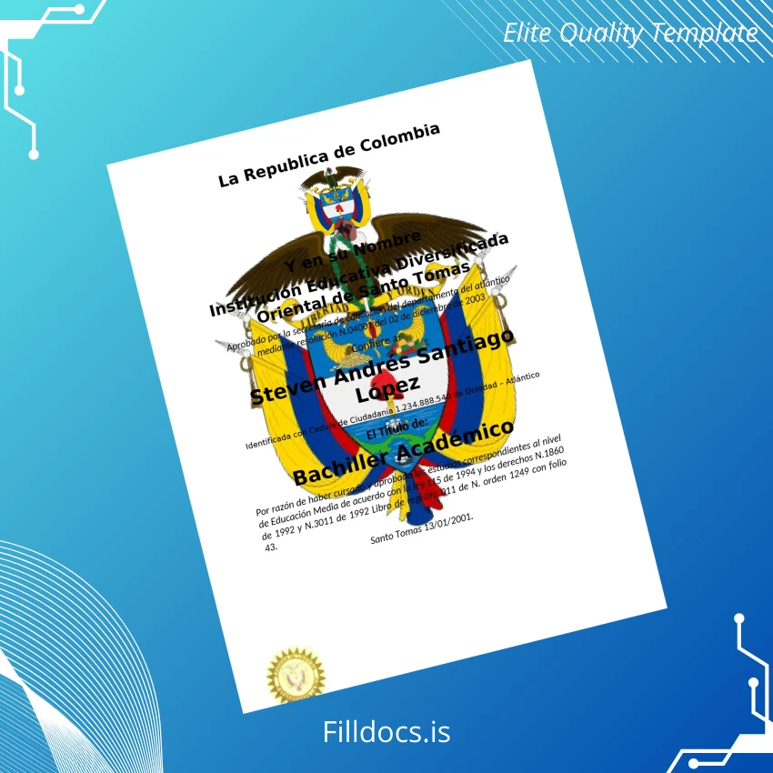 This Colombia Institución Educativa Diversificada Oriental de Santo Tomás Academic Bachelor Diploma Template – Word/PDF is a meticulously designed, fillable digital diploma form tailored for educational institutions and professionals who need a fast and reliable replacement or custom diploma creation solution. Crafted for those requiring both elegance and precision, this template offers an editable diploma layout that ensures all academic credentials can be accurately represented with professional finesse.