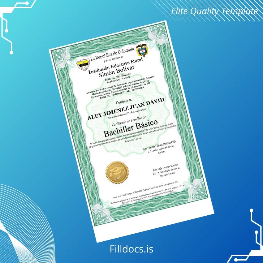 Colombia Institución Educativa Rural Simón Bolívar Basic High School Diploma Template – Word & PDF High-Resolution