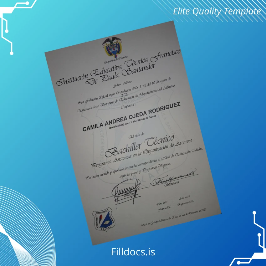 This template serves as an editable diploma form specifically tailored for the Colombia Institución Educativa Técnica Francisco de Paula Santander Bachiller Técnico in Asistencia en la Organización de Archivos. It is a customizable degree template that enables users to modify essential details such as student name, date, and institution info with ease. This digital diploma download complements those looking for an efficient solution to create or replace official academic certificates without hassle.