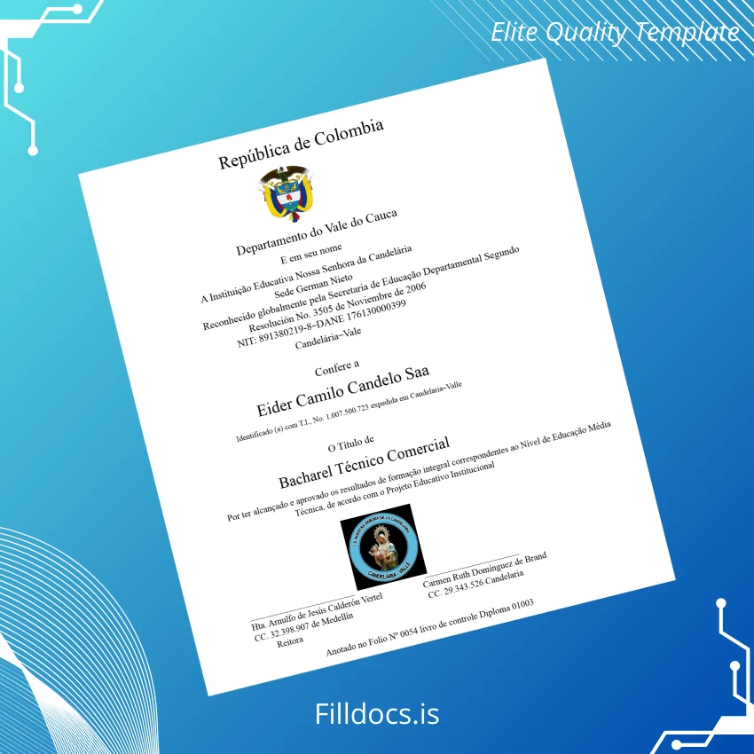 Discover the Colombia Institution Educativa Nuestra Señora de Candelaría Bachelor of Commercial Technician Template – Word/PDF, a versatile and professionally designed fillable diploma certificate solution tailored for educators and administrative professionals. This digital diploma download offers an editable and customizable degree template, ensuring you promote institution authenticity while simplifying document management. Whether you need a replacement diploma template or a blank diploma form to suit diverse student certifications, this template is your ideal choice.