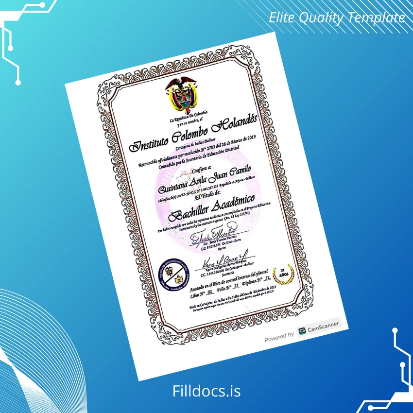 Discover the Colombia Instituto Colombo Holandés Academic Bachelor Diploma Template – Word/PDF, a premium fillable diploma design crafted for professionals seeking a quick and reliable academic credential solution. This digital diploma download offers a customizable and editable format to suit your exact needs, combining modern style with traditional formality.
