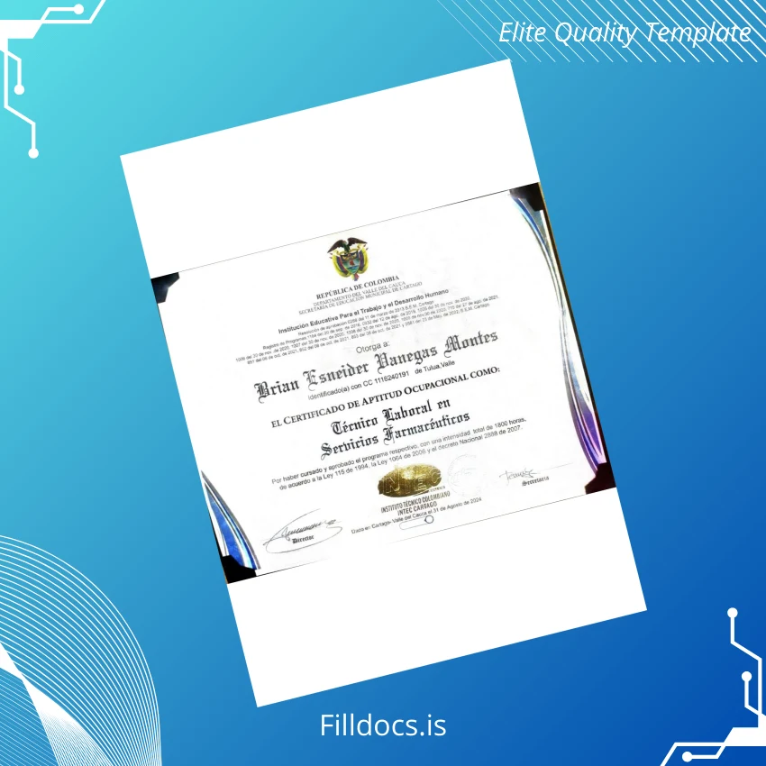 The Colombia INTEC CARTAGENA Technical Certificate in Pharmaceutical Services Template is a professional and editable digital diploma designed for seamless customization and quick replacement needs. Crafted to meet the highest standards, this template allows pharmaceutical professionals and institutions to recreate authentic certificates with remarkable precision and ease.
