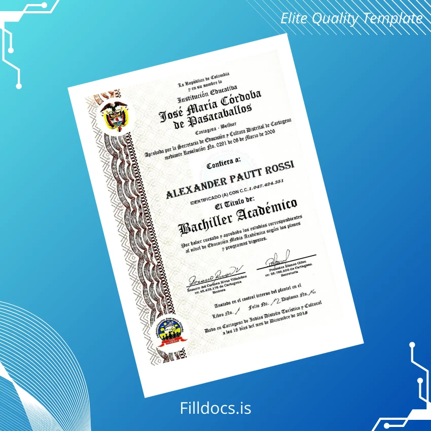 This template is a high-quality, fillable diploma certificate that can be edited and customized using common word processing software or PDF editors. It provides a blank diploma form designed specifically for Colombia José María Córdoba de Pasacaballos High School graduates, enabling users to create a professional and authentic looking replacement diploma or novelty diploma design with ease.