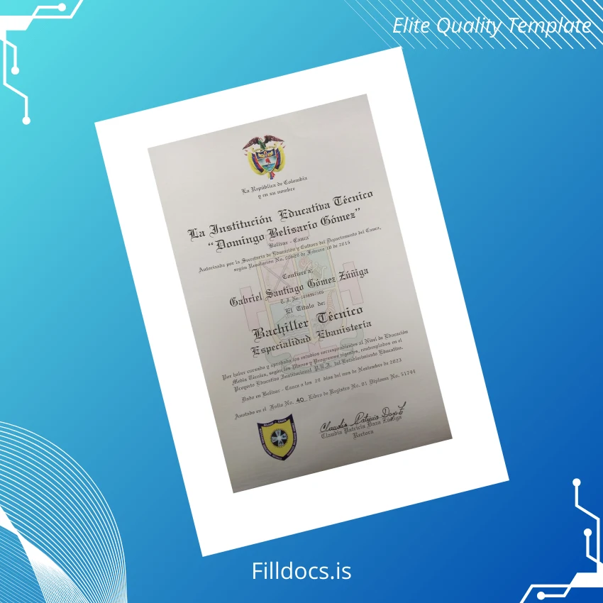 This is a high-quality, editable diploma template specifically crafted for the Colombia La Institución Educativa Técnica “Domingo Belisario Gómez” Technical High School Diploma in Banking. It offers a layout that closely mimics the original diploma’s formal design while supporting full customization for recreations or replacements.
