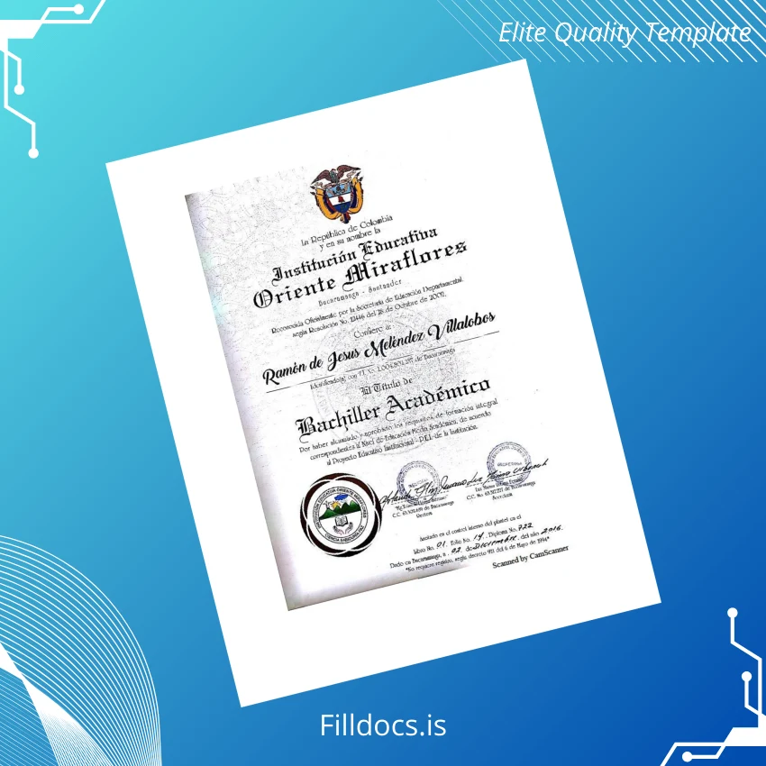 This template is a customizable degree certificate crafted to replicate the official Colombia Oriente Miraflores Academic Bachelor diploma. It enables users to produce a professional diploma with editable fields to input names, dates, and other academic details instantly. Ideal for those requiring a replacement diploma or a novelty diploma design, it comes in a versatile Word and PDF format ensuring broad compatibility.