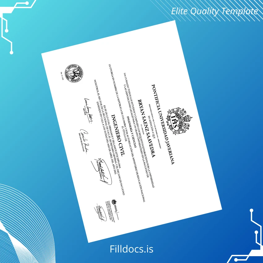 Discover the Colombia Pontificia Universidad Javeriana Bachelor of Civil Engineering Diploma Template – Word/PDF, a meticulously designed fillable diploma certificate template crafted for professionals who need a reliable and customizable document solution. Ideal for those requiring a replacement diploma or a novelty diploma design, this editable template offers an efficient way to create a highly professional certificate without compromising on quality or authenticity.