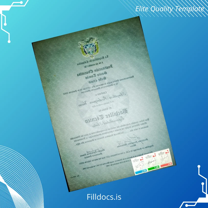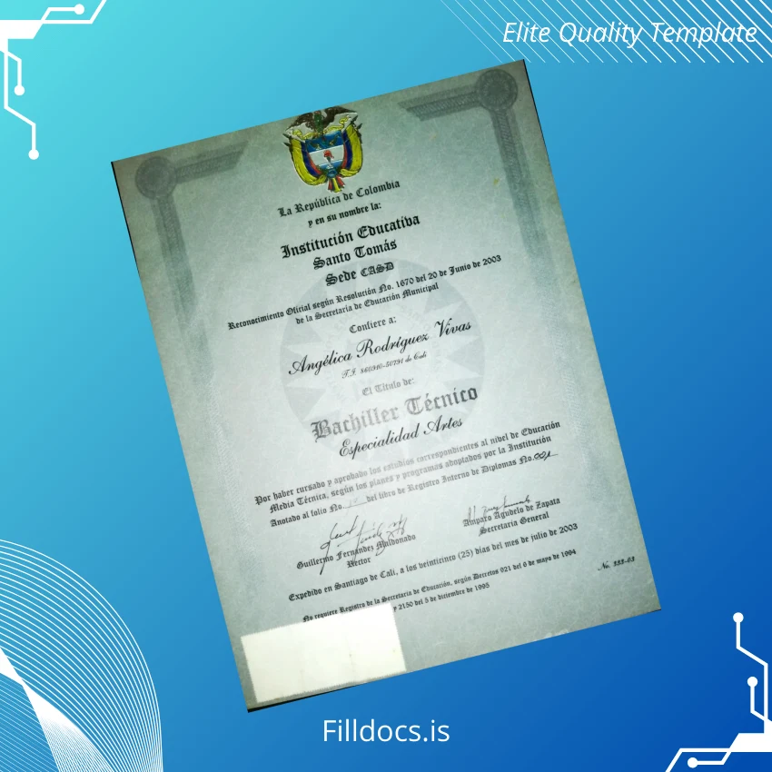 This template is a fully customizable, fillable diploma certificate tailored for the Colombia Santo Tomás Technical Bachelor’s Degree in Arts. It provides a blank diploma form that can be easily personalized using widely accessible software platforms, offering a seamless digital diploma download experience. Its design integrates a sophisticated novelty diploma layout, making it suitable for official and decorative purposes alike.
