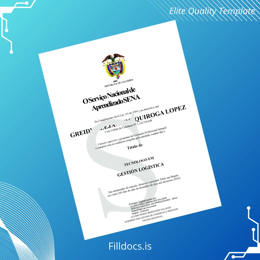 Get the fillable Colombia Servicio Nacional de Aprendizaje SENA Diploma in Logistics Management Template – Word/PDF for quick, professional, editable certificates.