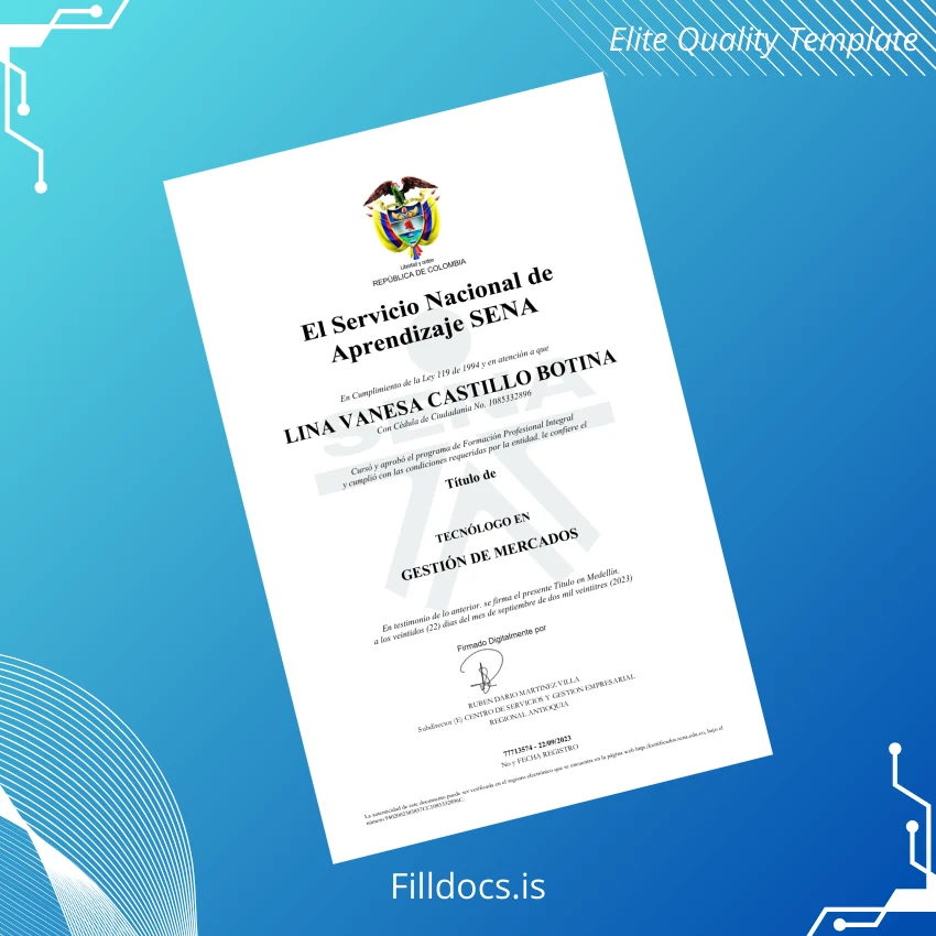 Discover the Colombia Servicio Nacional de Aprendizaje SENA Tecnólogo en Gestión de Mercados Template – Word/PDF, a professionally designed fillable diploma certificate template perfect for replacing or customizing your degree documents with ease and accuracy. This digital diploma download offers a high-quality, editable solution tailored for graduates, professionals, or institutions requiring a reliable and visually appealing diploma form that suits modern digital and print needs.