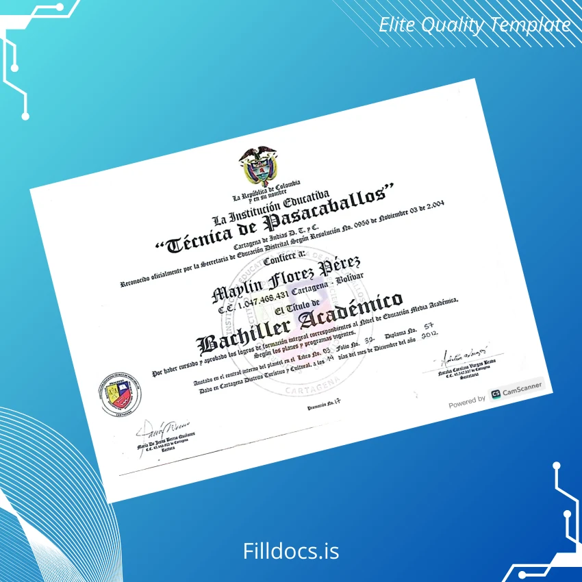 The Colombia Técnica de Pasacaballos Academic Bachelor Diploma Template – Word/PDF is a high-quality, fillable digital document designed for professionals who require a customizable and print-ready diploma certificate. This template provides an easy and efficient solution for creating a personalized diploma to replace lost, stolen, or expired certificates or to use as a decorative academic achievement display.