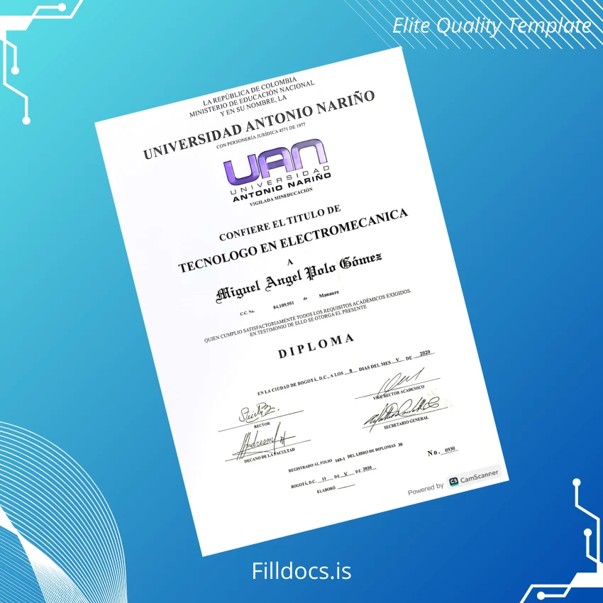 Discover the Colombia Universidad Antonio Nariño Technologist in Electromechanics Diploma Template – Word/PDF, a high-quality digital diploma design ideal for professionals needing a customizable and print-ready diploma certificate. This editable diploma template allows seamless personalization of your academic credentials, providing a convenient solution for replacing or updating your diploma.