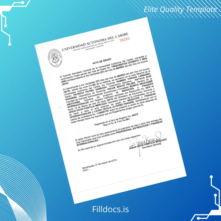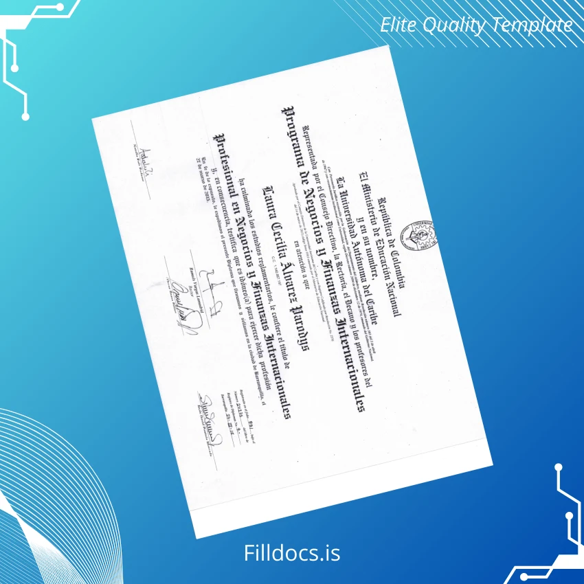 This fillable diploma template serves as a high-quality reproduction of the Colombia Universidad Autónoma professional diploma, customizable and ready to be personalized with your specific details. Whether you require a replacement diploma or a novelty diploma design, this template provides a blank diploma form that maintains authenticity and a polished look tailored to your exact requirements.