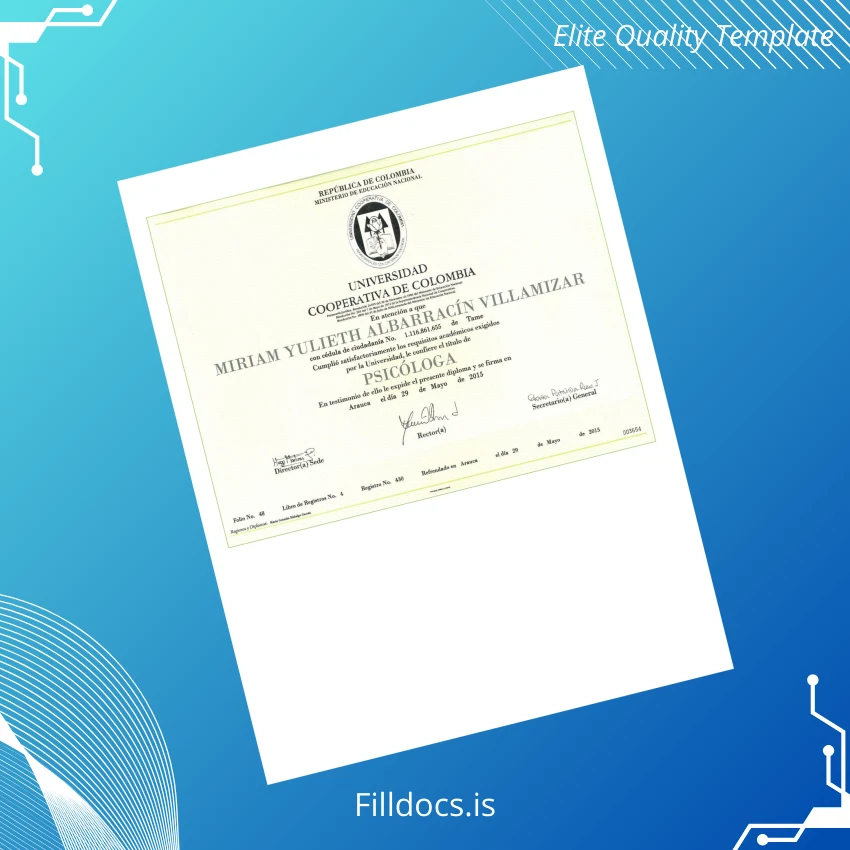 The Colombia Universidad Cooperativa de Colombia Bachelor of Psychology Diploma Template – Word/PDF is a premium, fillable document designed for individuals seeking a customizable and professional diploma format. Ideal for those needing a swift replacement or a personalized blank diploma form, this digital diploma download allows for seamless editing and high-resolution printing.