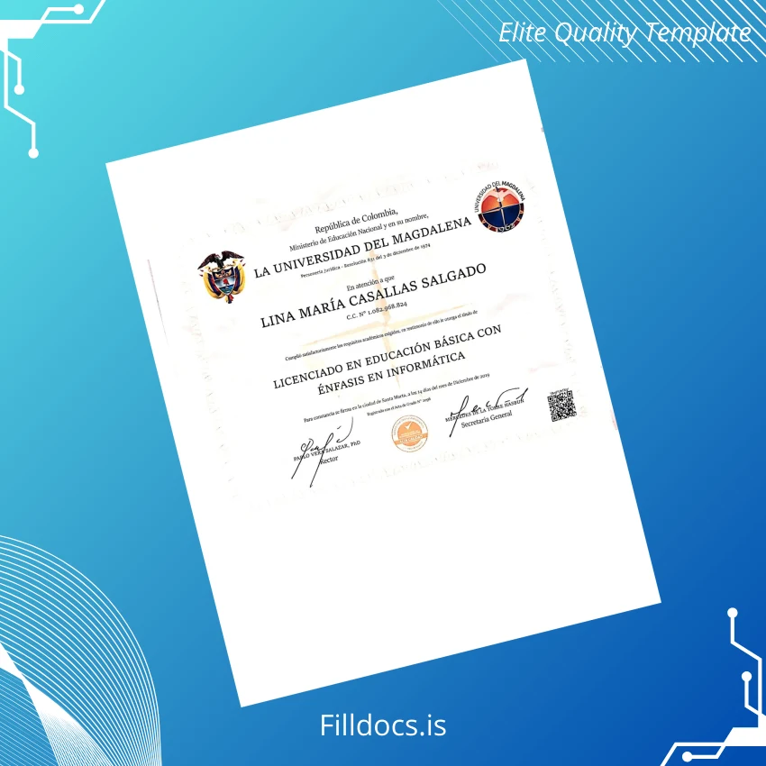 This fillable diploma template offers a professional and customizable solution for recreating the Colombia Universidad del Magdalena Bachelor of Education with Emphasis in Informatics certificate. Designed for educators and administrative professionals needing a reliable, editable document, this Word and PDF template ensures ease of use alongside high-quality presentation. Whether you require a replacement diploma or a novelty diploma design, this template accommodates swift editing and professional output.