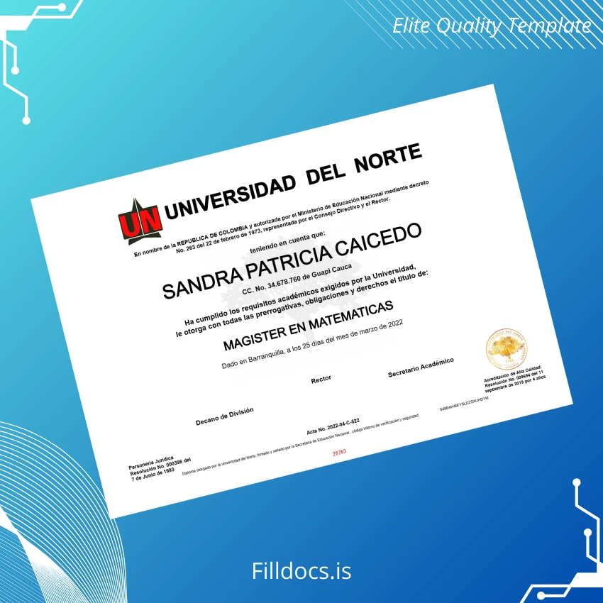 The Colombia Universidad del Norte Master in Mathematics Template – Word/PDF offers a professional, fillable diploma design tailored for graduates and educational institutions. This customizable degree template provides a seamless solution for creating authentic-looking certificates without the hassle of designing from scratch.