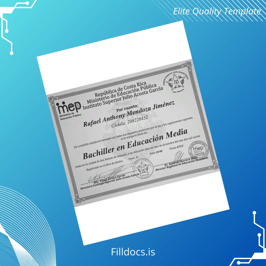 Discover the Costa Rica Instituto Superior Julio Acosta García High School Diploma Template – Word/PDF, a professional fillable diploma form designed for those requiring a customizable and reliable diploma certificate. This editable template suits educators, administrative professionals, or individuals needing a high-quality replacement diploma with ease and precision.