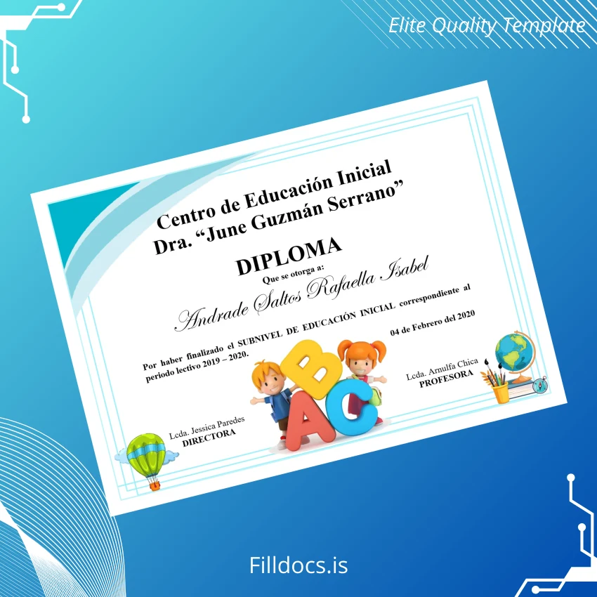 Discover the Ecuador Centro de Educación Inicial _Dra. June Guzmán Serrano_ Diploma in Initial Education Certificate Template – Word/PDF, a professional fillable diploma designed for educators and institutions needing a customizable, print-ready certificate. This editable diploma template offers a seamless solution for recreating or replacing official educational credentials with precision and style.