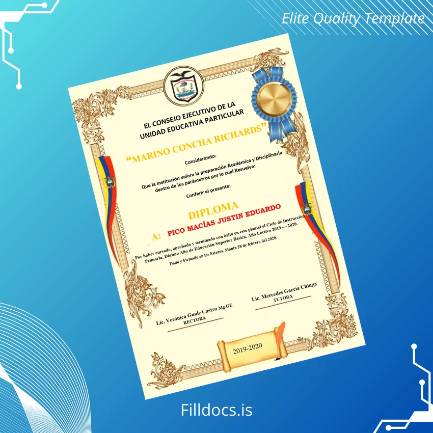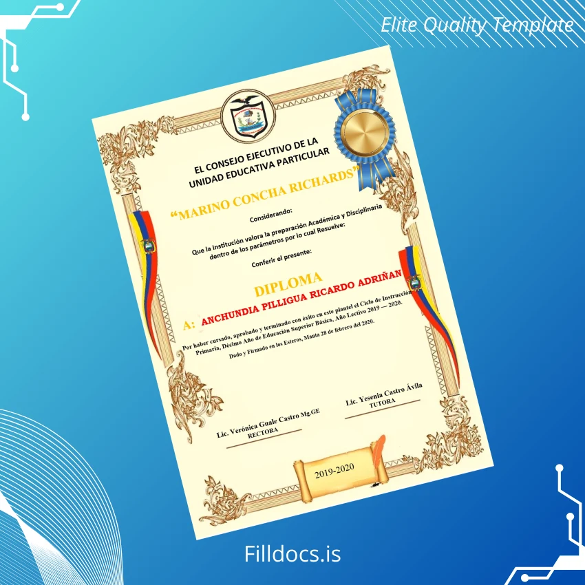 Discover the Ecuador Marino Concha Richards Diploma Certificate Template – Word/PDF, a versatile fillable digital document designed to simplify your certificate customization needs. This professional-grade diploma template provides an easy and efficient solution for individuals and institutions seeking a customizable degree form with a classic novelty diploma design that reflects authenticity and style.