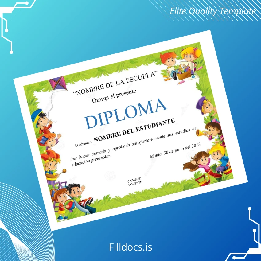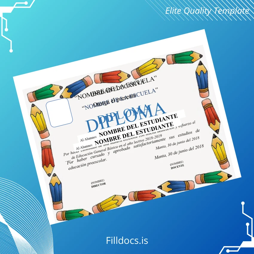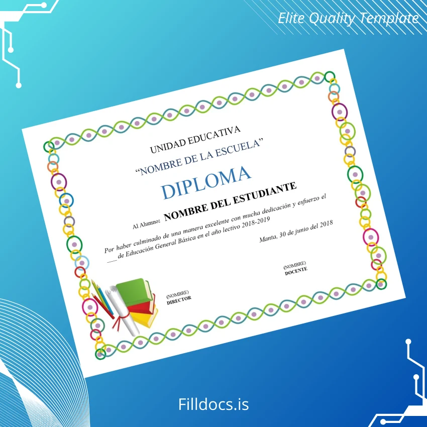 This diploma template is a digitally downloadable and editable Word and PDF file designed specifically for basic and preschool education diplomas under Ecuador’s Unidad Educativa system. It serves as a blank diploma form with a novelty diploma design tailored to meet formal recognition standards while offering an attractive layout that reflects educational excellence.