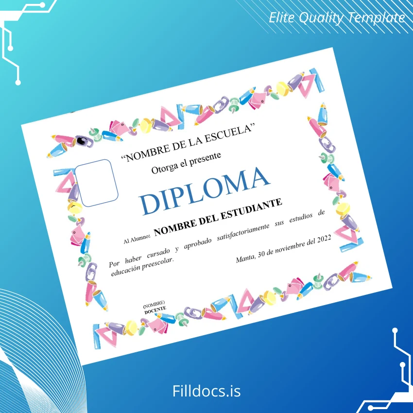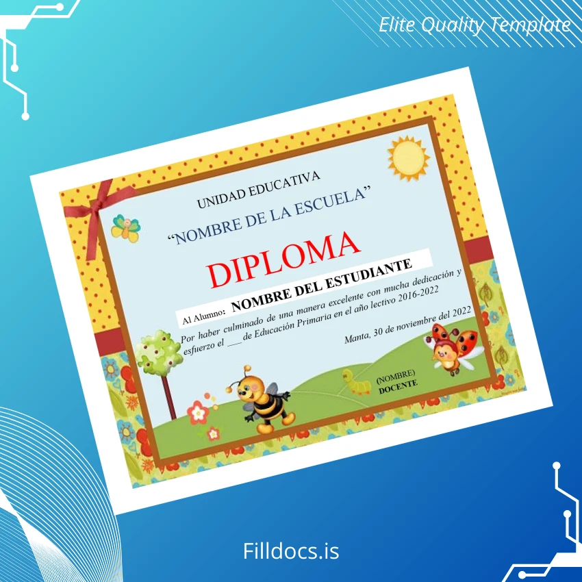 This editable diploma template is a professionally crafted certificate form tailored for Ecuador’s Unidad Educativa _Nombre de la Escuela_, suitable for awarding primary and preschool education diplomas. It offers a digital download in Word and PDF formats, enabling complete customization according to institutional branding and individual student information. Perfect for administrators and educators needing a clean, versatile diploma design, it supports official recognition and seamless record keeping.